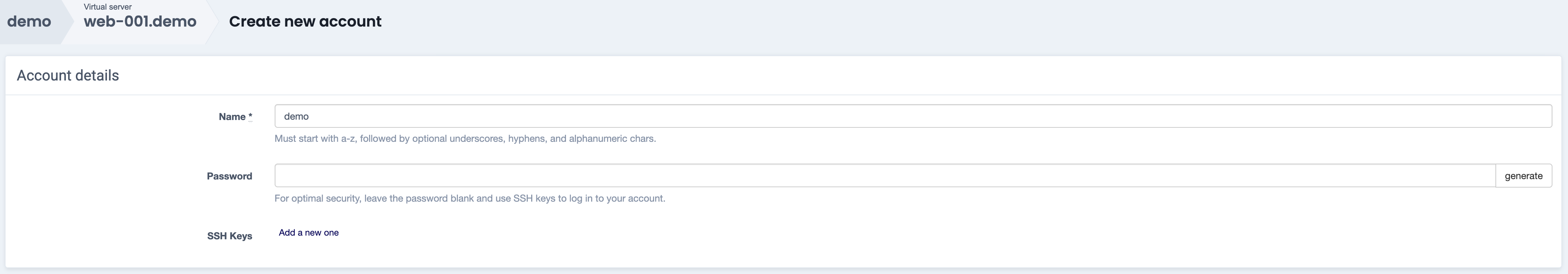 Name - name of your account. This will also be the Linux user you use to log in to the server for this account