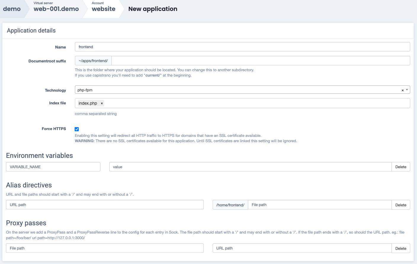 Technology - choose php-fpm to enable PHP for this application, or no_technology if PHP is not required