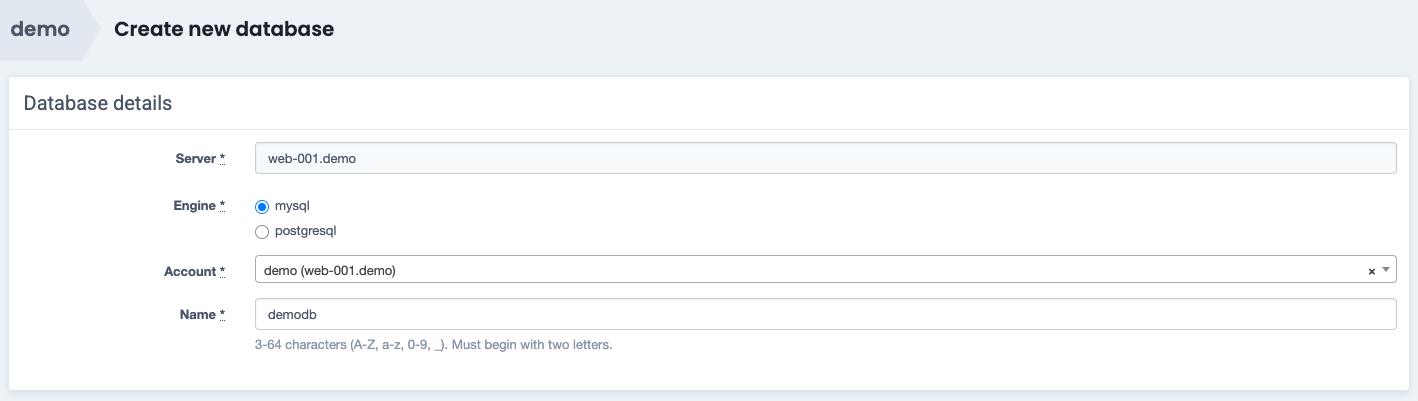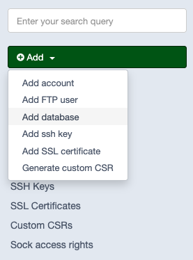 Alternatively, a database can also be created via New database in the Database widget of the Virtual server or Account user levels.