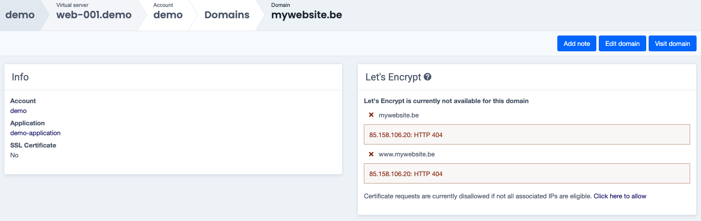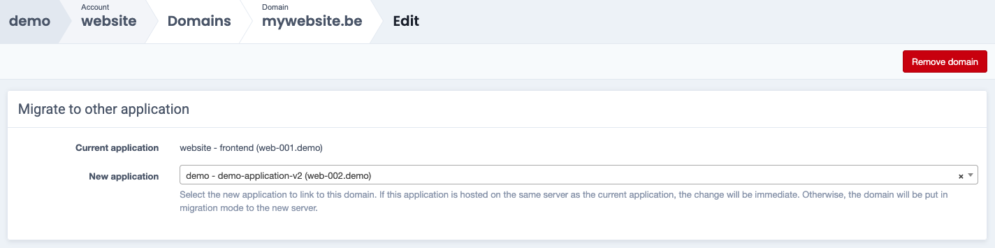 Once the DNS change has been propagated and the application is ready for use, finalize the domain move via Finish this migration.