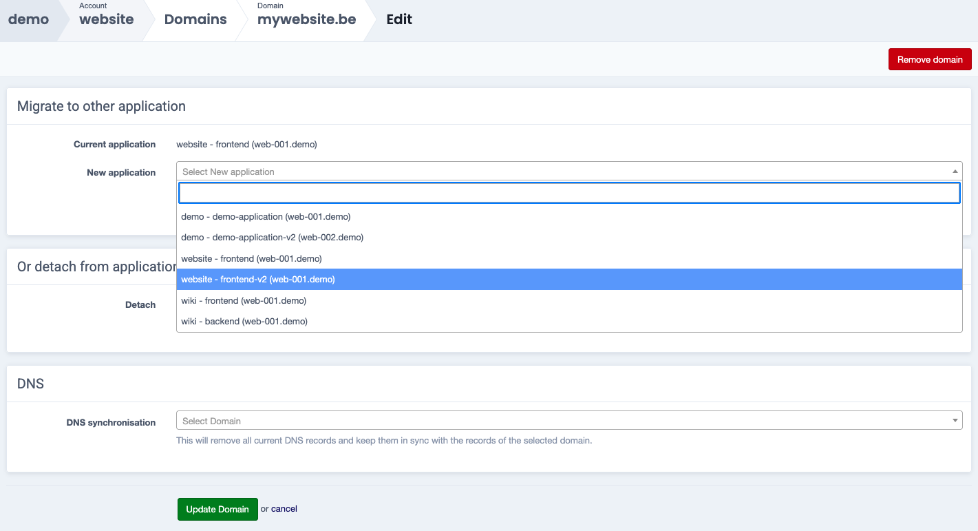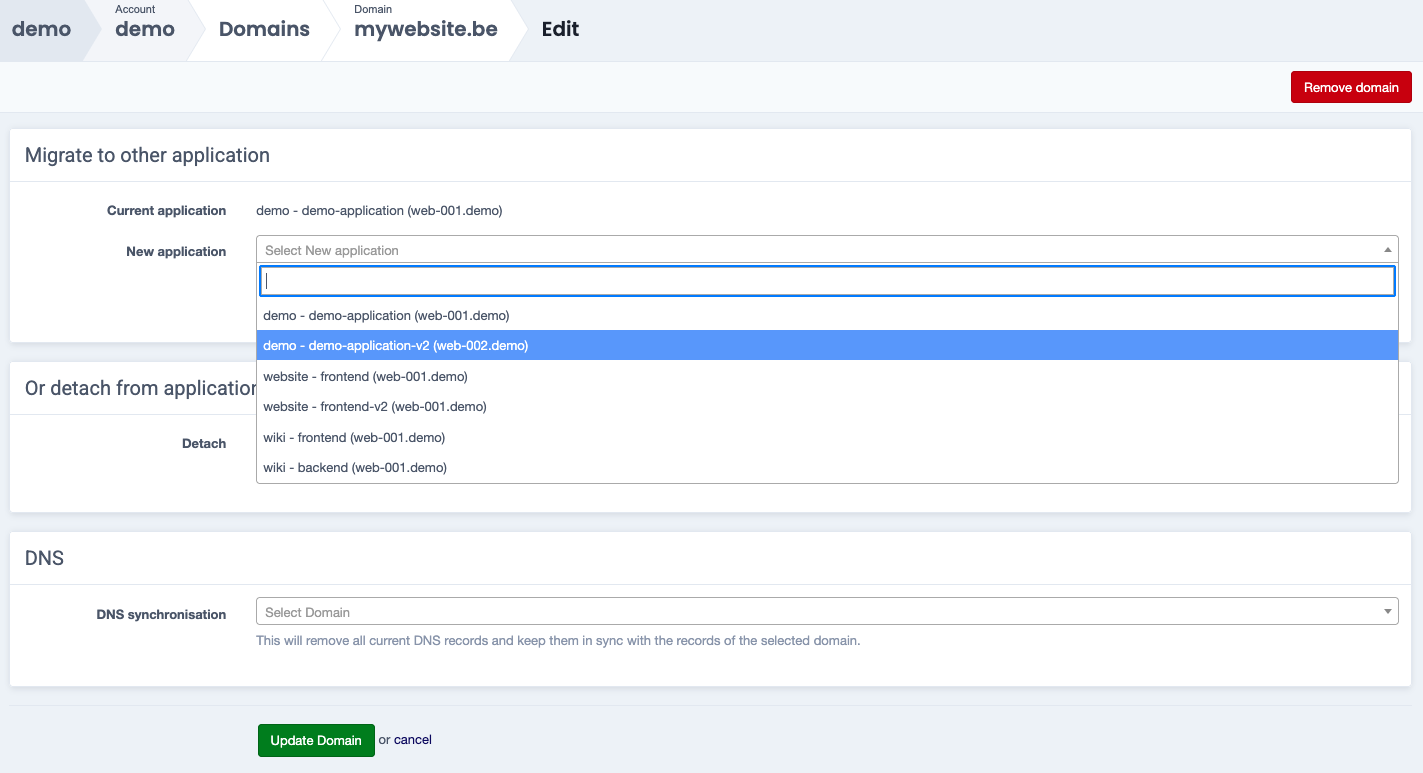 Select the new application that will be linked to the domain via the New application dropdown menu and confirm with Update Domain.