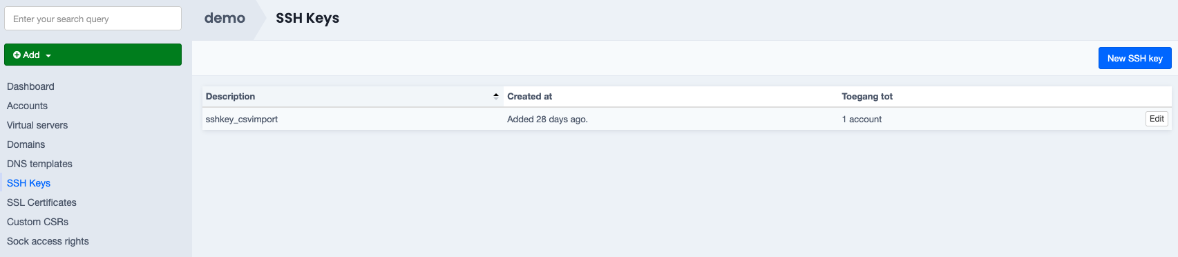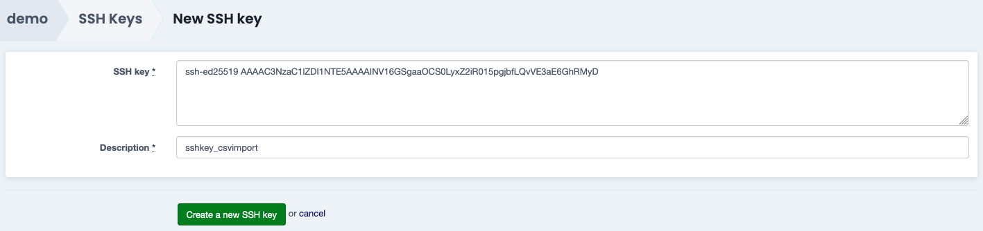 Enter the SSH key and its description and confirm with Create a new SSH key.