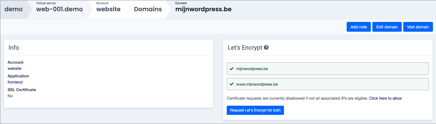 Once the Let's Encrypt certificate has been issued, Sock will automatically link it to the domain and subdomain it covers, and deploy it on the relevant virtual server(s).