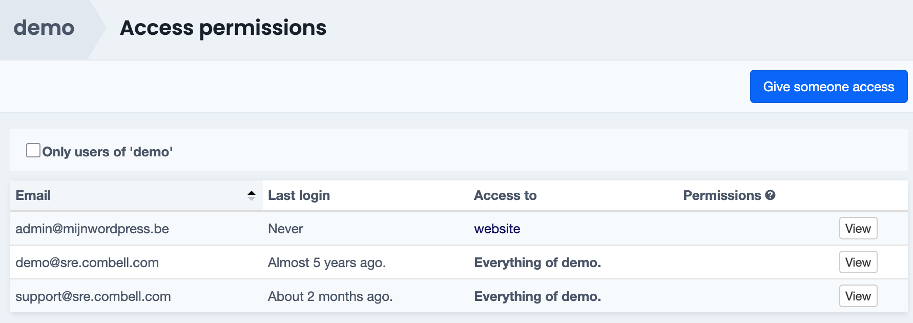 This overview lists all users and their access permissions.